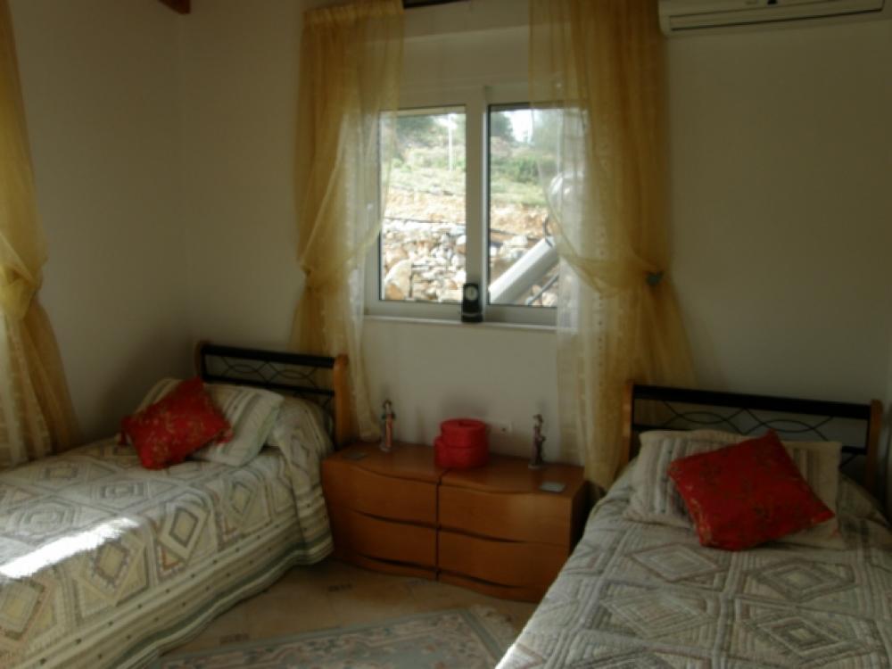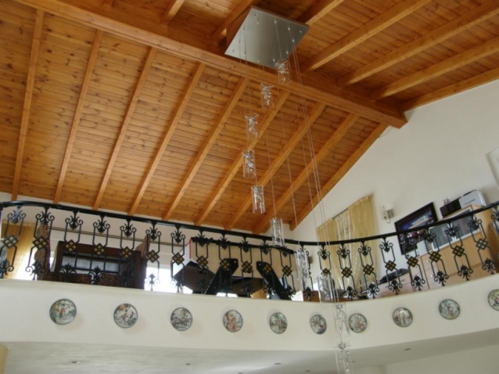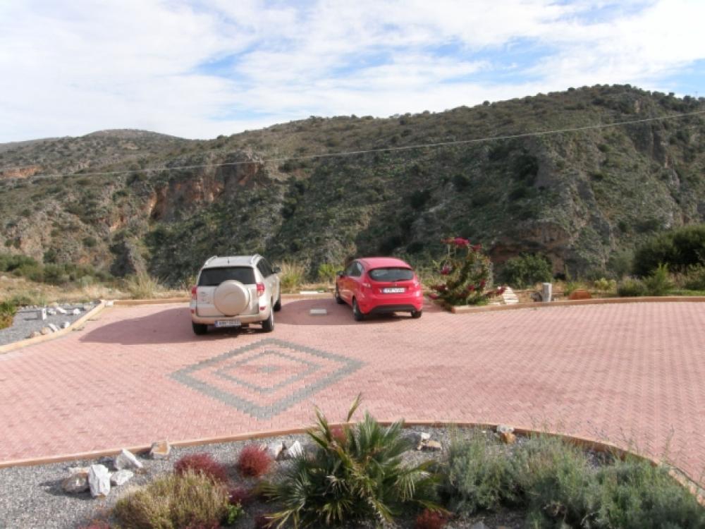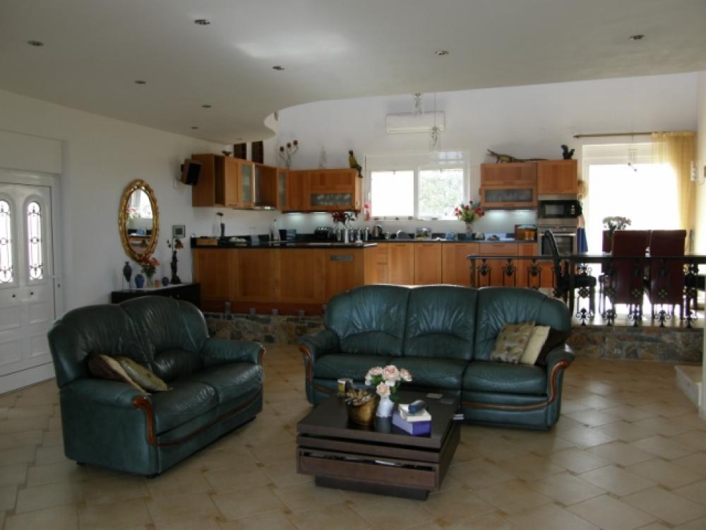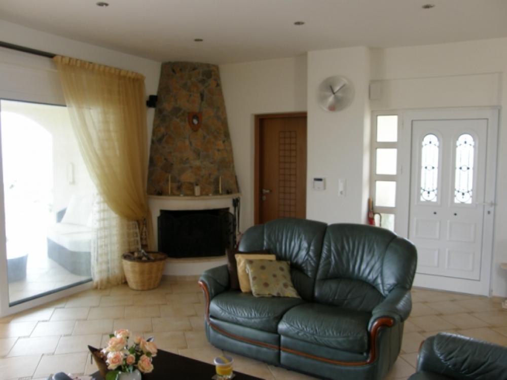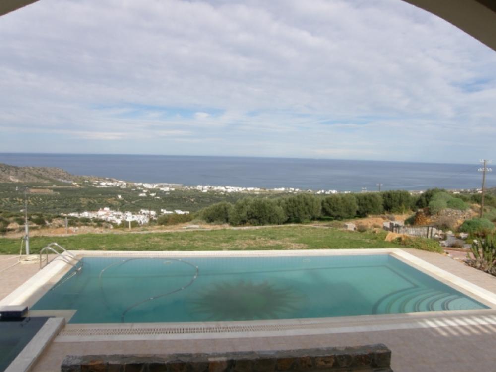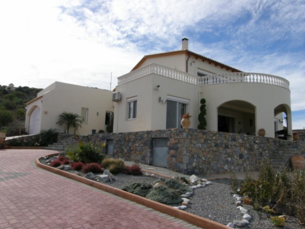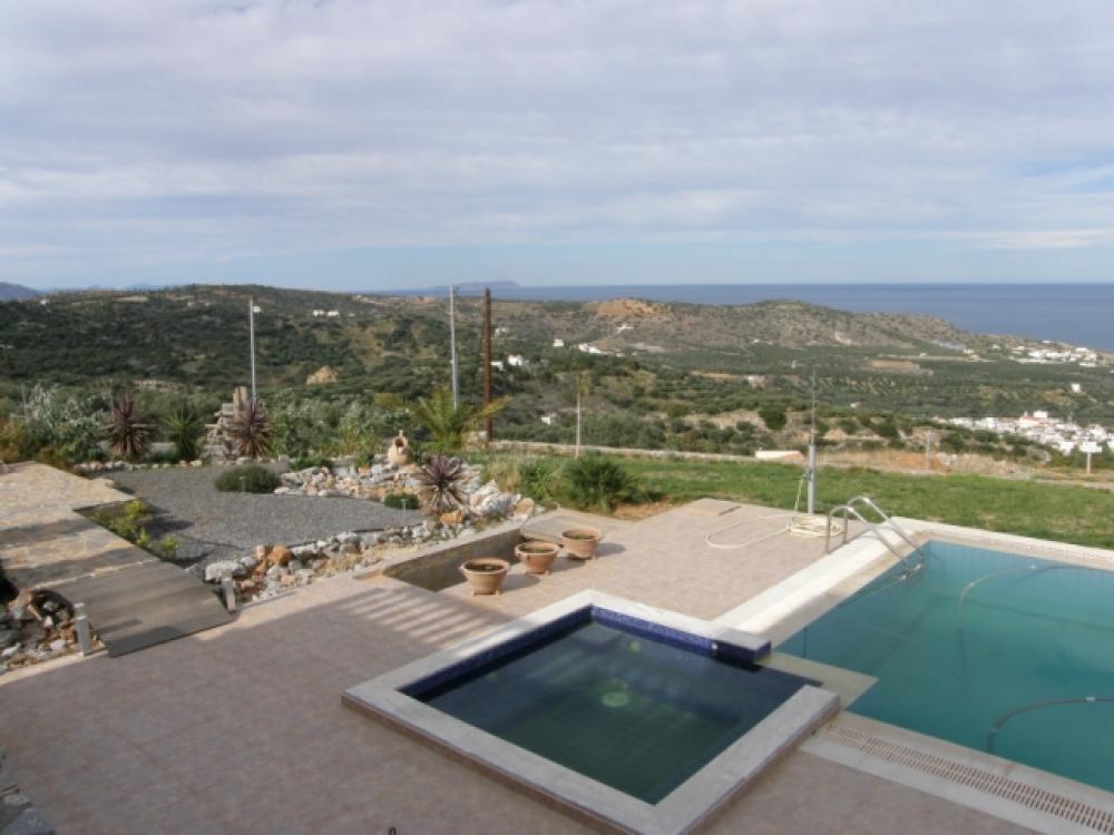 An imposing 267m2 villa is for sale 4km from the beach in Milatos, 15km from Neapolis and 25km from Aghios Nikolaos, the major resort of Eastern Crete. The villa built on a 6000m2 plot enjoys a wonderful view across the countryside to Blue Aegean. It has a gated entrance to block paved driveway with extensive parking sweeping up to a 45m2 double garage and the main villa entrance past a lovely low maintenance landscaped garden. There is a spacious open plan lounge with feature fireplace and a tiered quality fitted kitchen and dining area. The living area opens to a large semi-circular covered patio overlooking the 50m2 pool which is complete with Jacuzzi. Also, on the ground floor are three large fitted bedrooms, two opening to the patio (one of which has an en-suite bathroom) and a large bathroom with both bath and shower. From the lounge area a marble staircase leads to an open mezzanine with exposed beam ceiling (suitable for a multitude of uses, playroom, study, etc) which opens to a large semi-circular balcony with pillar balustrade, There is a solar system, air-conditioning through out, satellite, BBQ and 3cubic metre water storage tank to complete this delightful home or holiday retreat