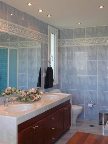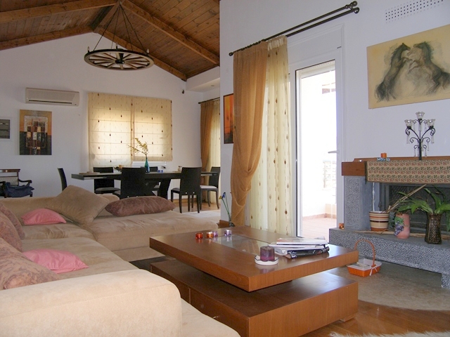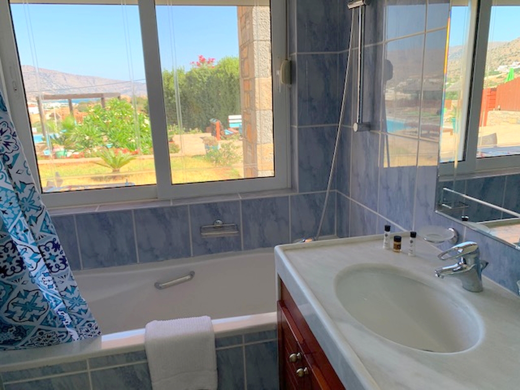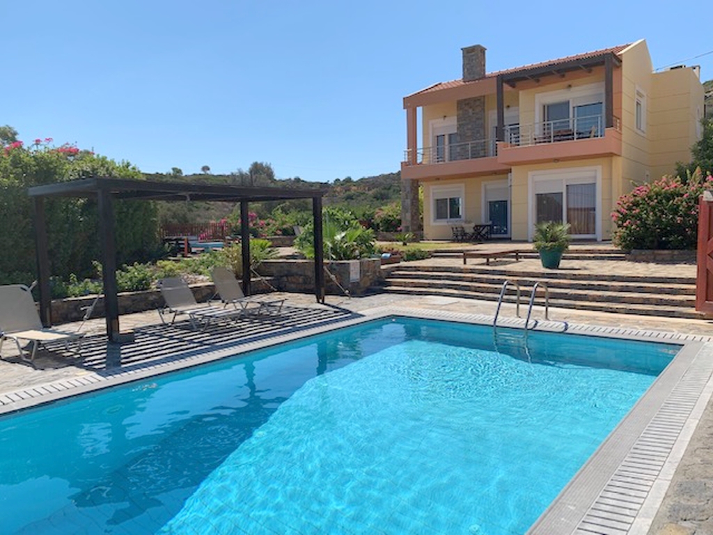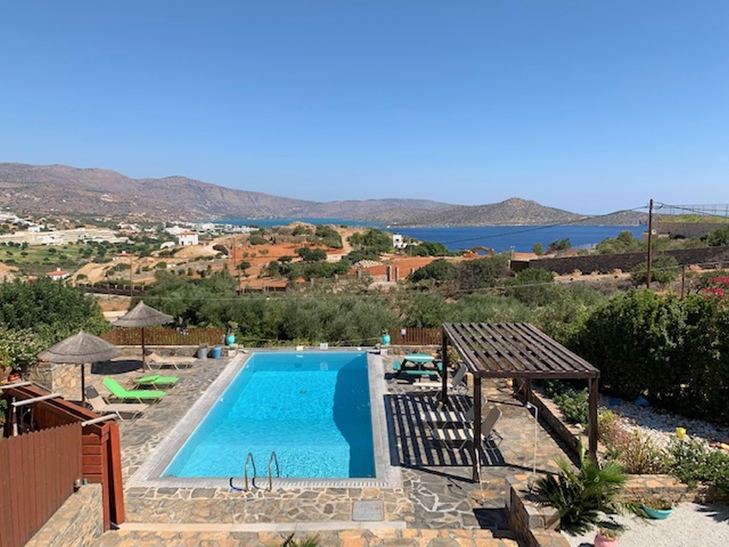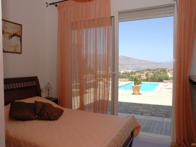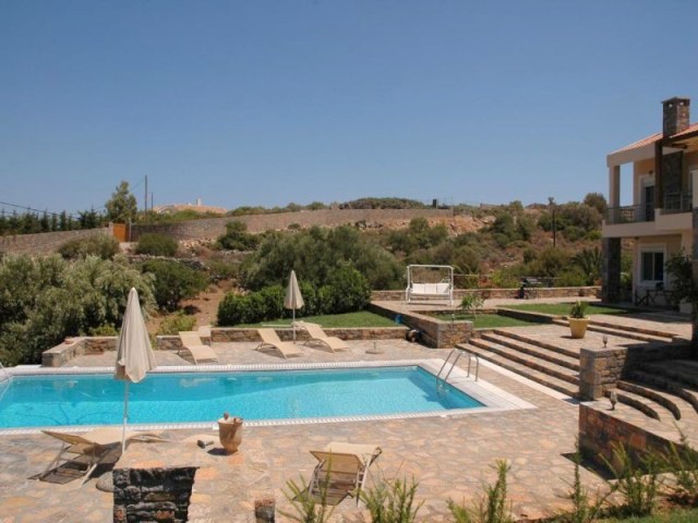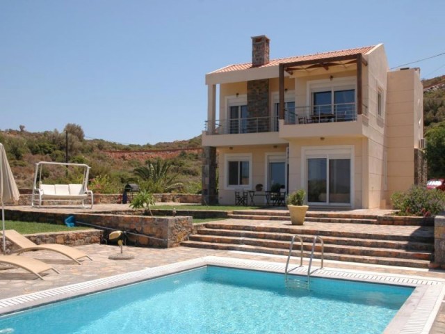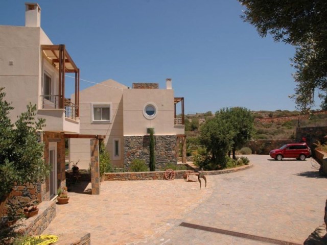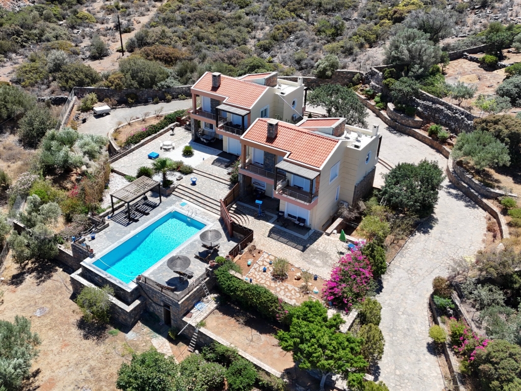 Two 4 bed villas are for sale located only 300m from the sea, less than 2km from the bustling resort of Elounda and 7km from picturesque Aghios Nikolaos, Eastern Crete. The view of Elounda Bay, the island of Spinalonga, Mirabello Bay and the distant mountains is one of the finest in the entire Mediterranean. These almost identical 250m2 villas are on a slightly sloping 4000m2 plot and are basically on three levels. The lower level has a storage room, a separate bathroom with shower, a utility room, a boiler room, and an area that is in one a studio apartment and a double bedroom in the other both with a door leading to the swimming pool. The middle level encompasses two large fitted double bedrooms (one with French door to the pool), a bathroom and the master fitted bedroom with en-suite shower and bath again with doors to the pool. The main living area is sensibly on the upper floor to take maximum advantage of the views, and comprises a spacious open plan lounge (with feature fireplace) and dining area, with French doors to two separate balconies. Separated from the living area by a room divider is a designer kitchen complete with larder and a door to yet another balcony. The stone wall with a gated entrance encircles the extensive garden, paved patio areas, BBQ, lawns and 50m2 sea water swimming pool (with drilling for water supply) shared by both villas. Each villa, has quality parquet flooring in all the main rooms, is centrally heated, fully air conditioned, has provision for an emergency generator and a de-salination plant for potable water supply,there is also a 230m2 garage /store Altogether, it is a wondrous place to live or to have as a holiday retreat.