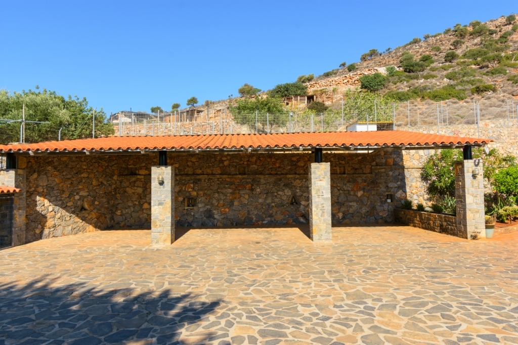 A beautiful 380m2 villa set in 4000m2 of landscaped grounds is for sale less than 2km from the Blue Flag beaches in picturesque Aghios Nikolaos, the major town of Eastern Crete. The fitted entrance hall has a stairwell and opens to a spacious lounge with feature fireplace, a dining room, a sitting room with sea views and terrace access and a top range fitted dining kitchen. Stairs lead up to the master en-suite bedroom with dressing room and on to three double bedrooms (one en-suite) and a large bathroom. Stairs also, lead down to: a children's play room, kitchen, utility room, and a Gym with sauna, shower and unfinished hydro-massage. With a little adaption this area could be a self-contained guest apartment. Externally, there is a gated drive to covered parking, a BBQ, Garden watering system; stone terraces an unfinished swimming pool with wonderful view over the town to the sea. Built in 2004, to a high specification using all the best materials it has marble floors, central heating, double glazing, electronic shutters and security system, all of which combine to make a home or holiday villa to be proud of.