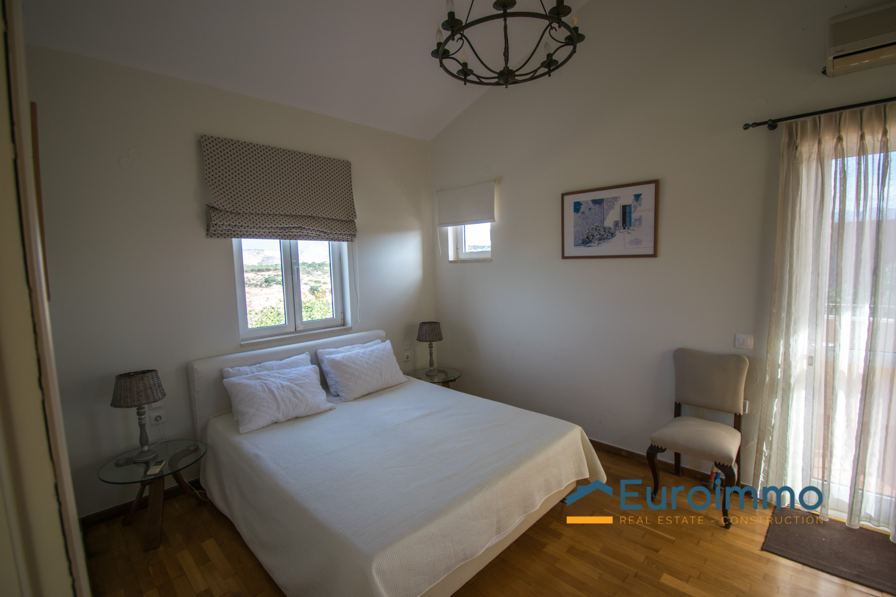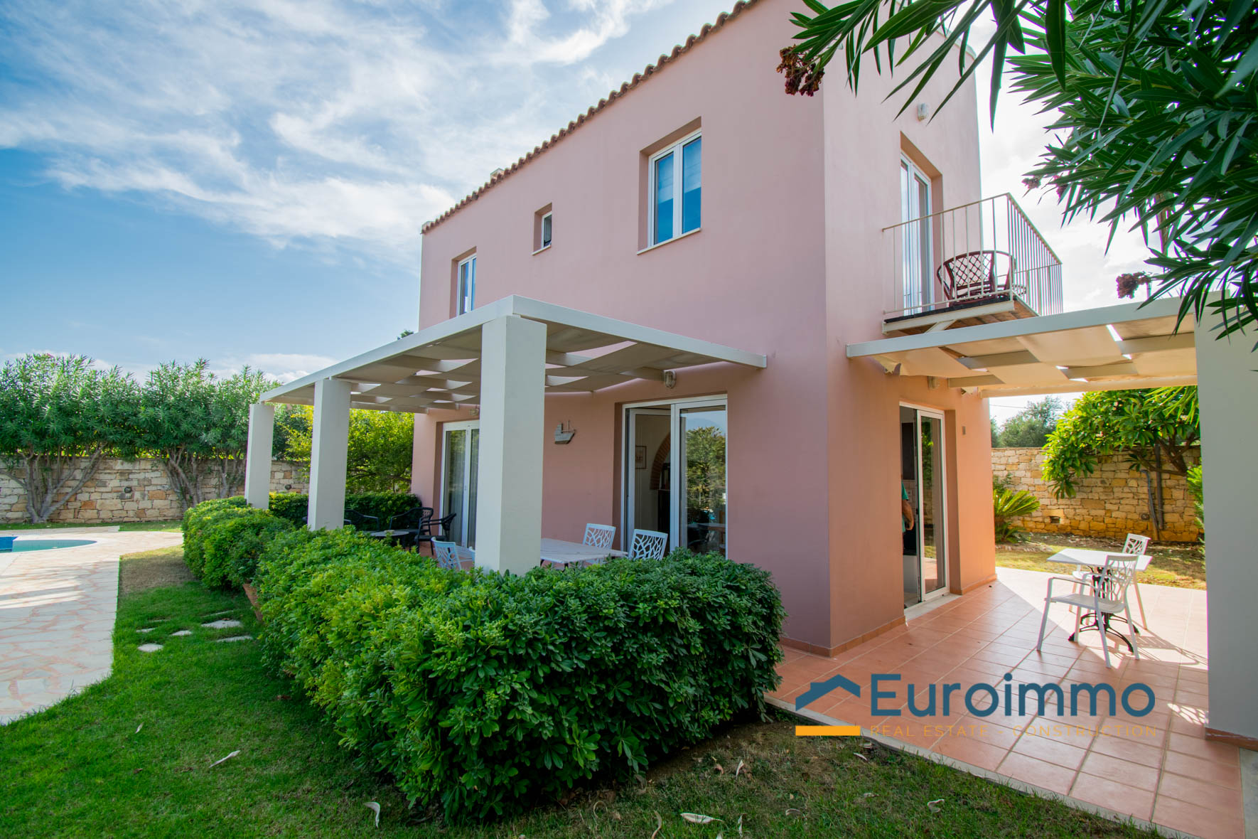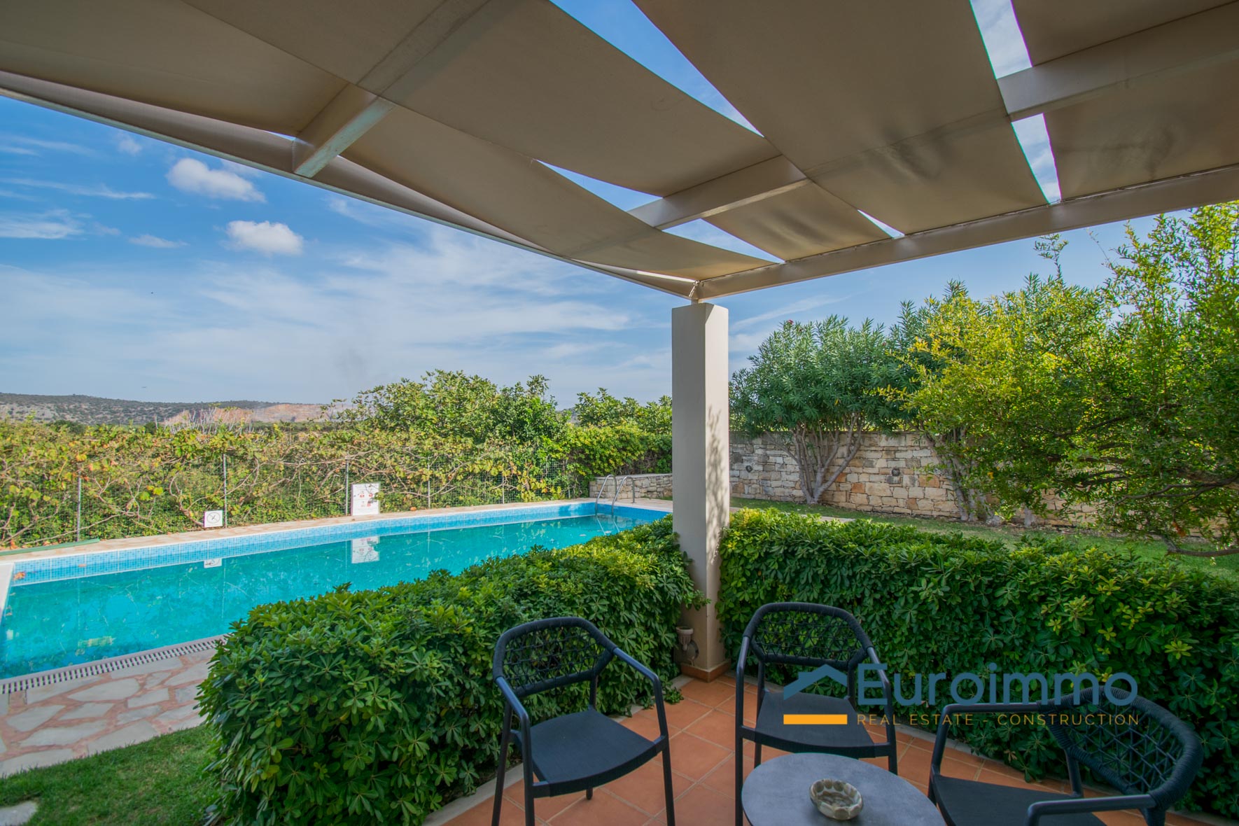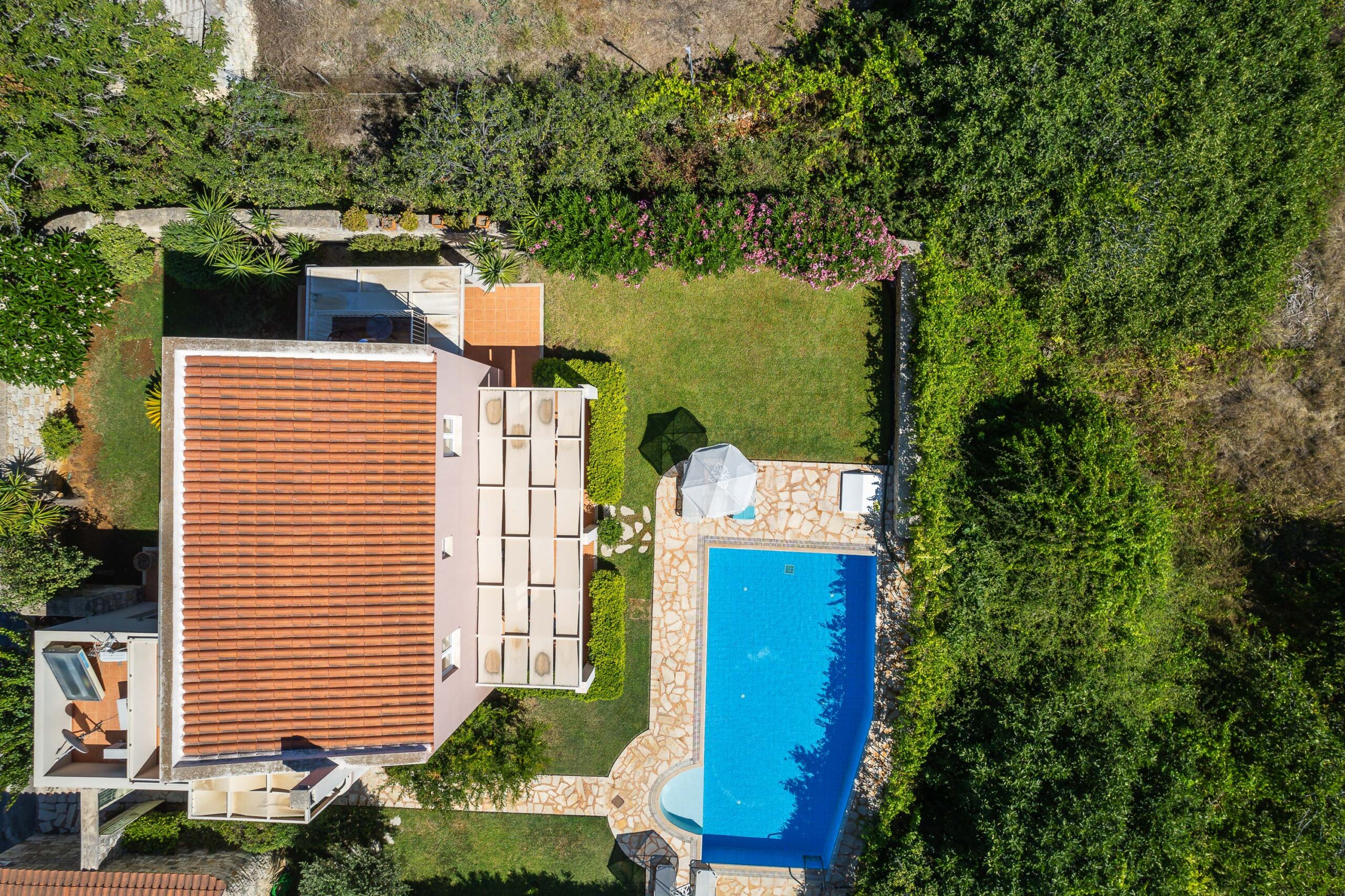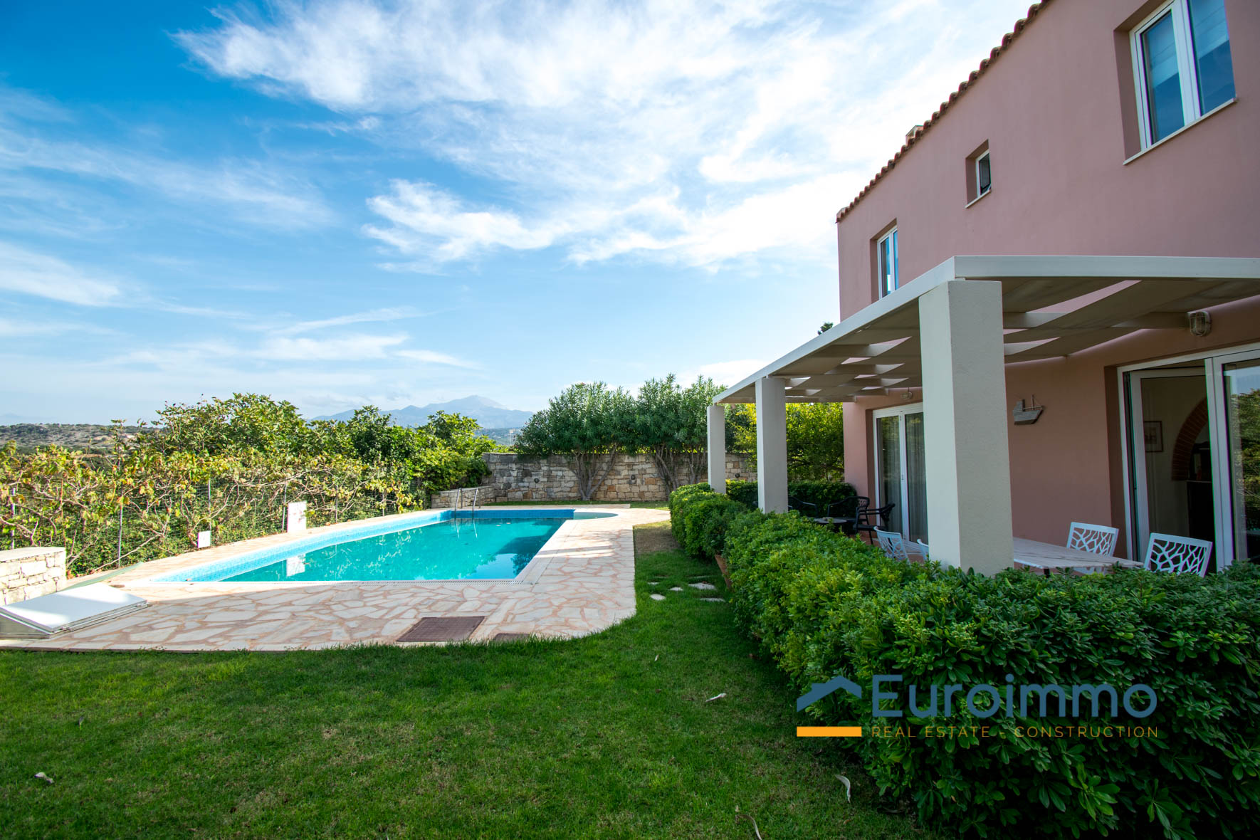 The villa for sale with pool is located on enclosed and well-maintained garden property in the beautiful and quiet atmosphere of a village. The free-standing, comfortable villa with pool is tastefully furnished and provides highest standards. Tradition and modernity in perfect balance are reflected in the interior of the villa. The well-maintained, green garden around the pool invites you to relax and simply enjoy your holiday. The beautiful wide view across the surrounding landscape is very relaxing and calming. On two floors the villa provides ample space and privacy to their guests. The living room on the ground floor is joined to an open kitchen with an arcade arch. A large sliding door opens the complete front of the house towards the terrace and the pool and extends the living room to the outside. From the kitchen you have direct access to a side terrace. The roofed terraces of the villa are ideal locations to relax in the sun or enjoy a meal in the open in a shady spot. 1 bedroom with exit to the side terrace and a bathroom are on the ground level. 2 bedrooms with a shared bathroom are on the first floor. One of the bedrooms has direct access to a private balcony that is the ideal place to read in quiet or relax and it has a magnificent view across the beautiful landscape. The 43sqm pool (4,5 x 9,5m, 1,30 to 1,60m deep, not heated) with surrounding lawn is perfect for a refreshing splash to escape the summer heat.