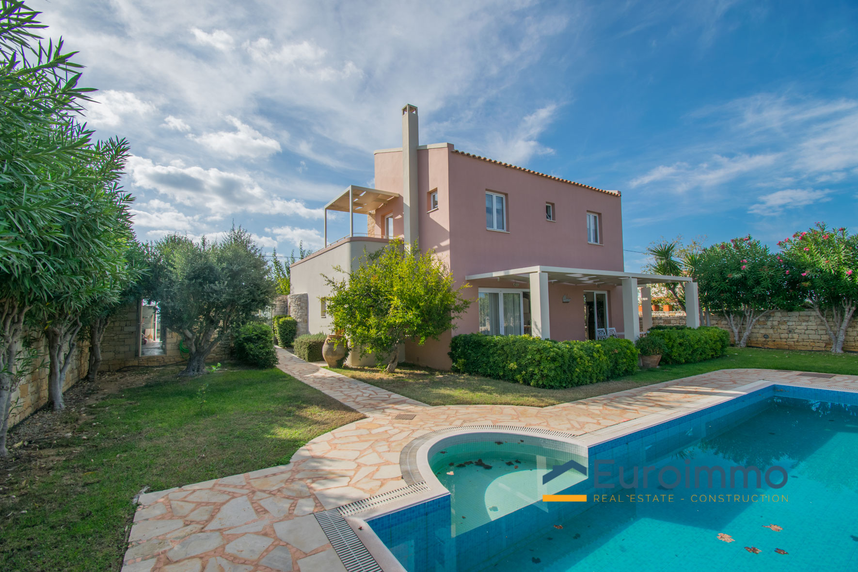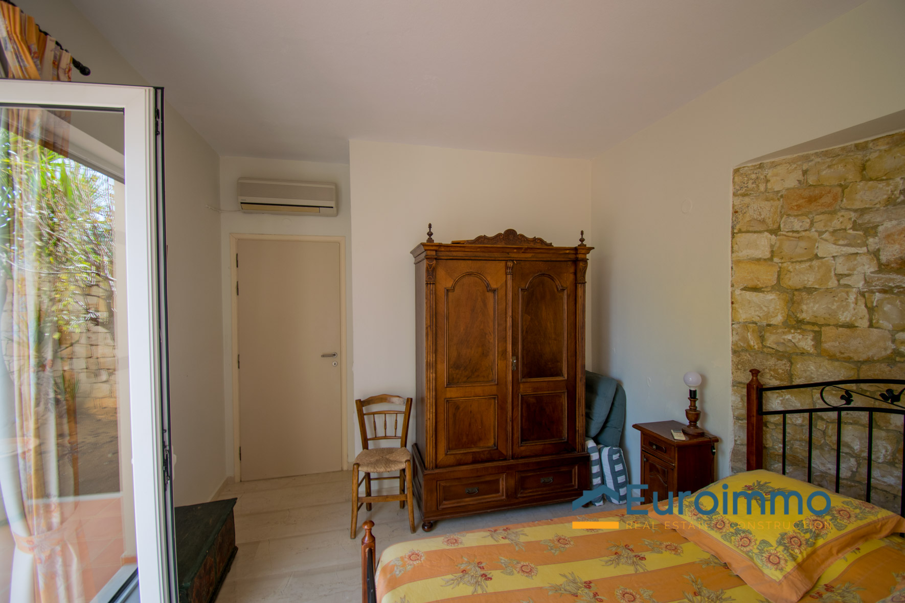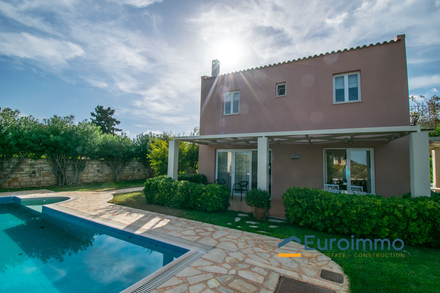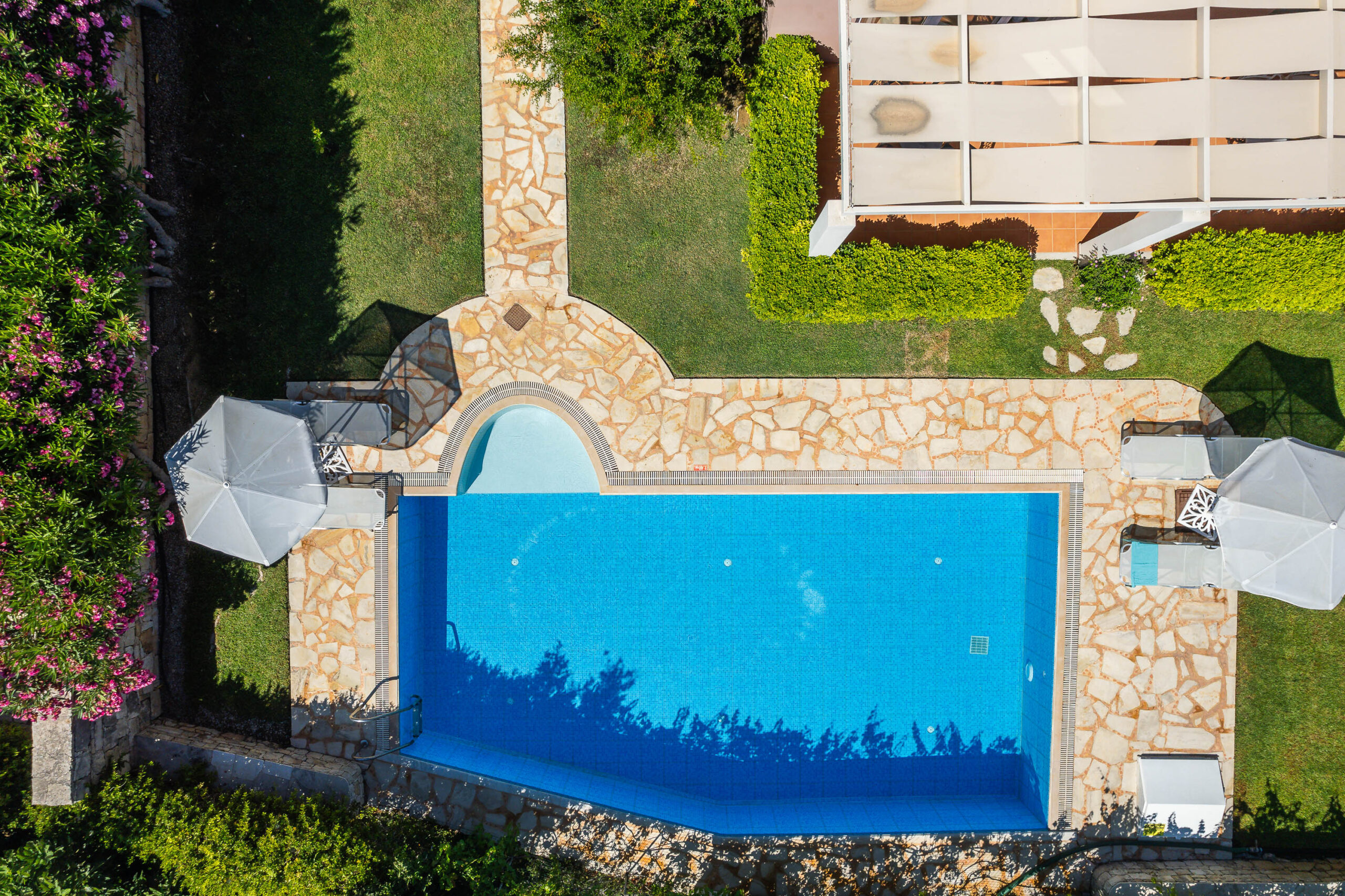 The villa for sale with pool is located on enclosed and well-maintained garden property in the beautiful and quiet atmosphere of a village. The free-standing, comfortable villa with pool is tastefully furnished and provides highest standards. Tradition and modernity in perfect balance are reflected in the interior of the villa. The well-maintained, green garden around the pool invites you to relax and simply enjoy your holiday. The beautiful wide view across the surrounding landscape is very relaxing and calming. On two floors the villa provides ample space and privacy to their guests. The living room on the ground floor is joined to an open kitchen with an arcade arch. A large sliding door opens the complete front of the house towards the terrace and the pool and extends the living room to the outside. From the kitchen you have direct access to a side terrace. The roofed terraces of the villa are ideal locations to relax in the sun or enjoy a meal in the open in a shady spot. 1 bedroom with exit to the side terrace and a bathroom are on the ground level. 2 bedrooms with a shared bathroom are on the first floor. One of the bedrooms has direct access to a private balcony that is the ideal place to read in quiet or relax and it has a magnificent view across the beautiful landscape. The 43sqm pool (4,5 x 9,5m, 1,30 to 1,60m deep, not heated) with surrounding lawn is perfect for a refreshing splash to escape the summer heat.