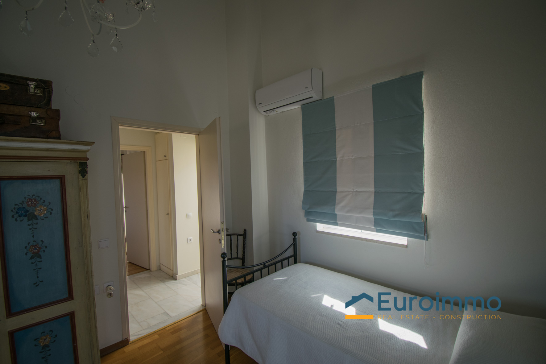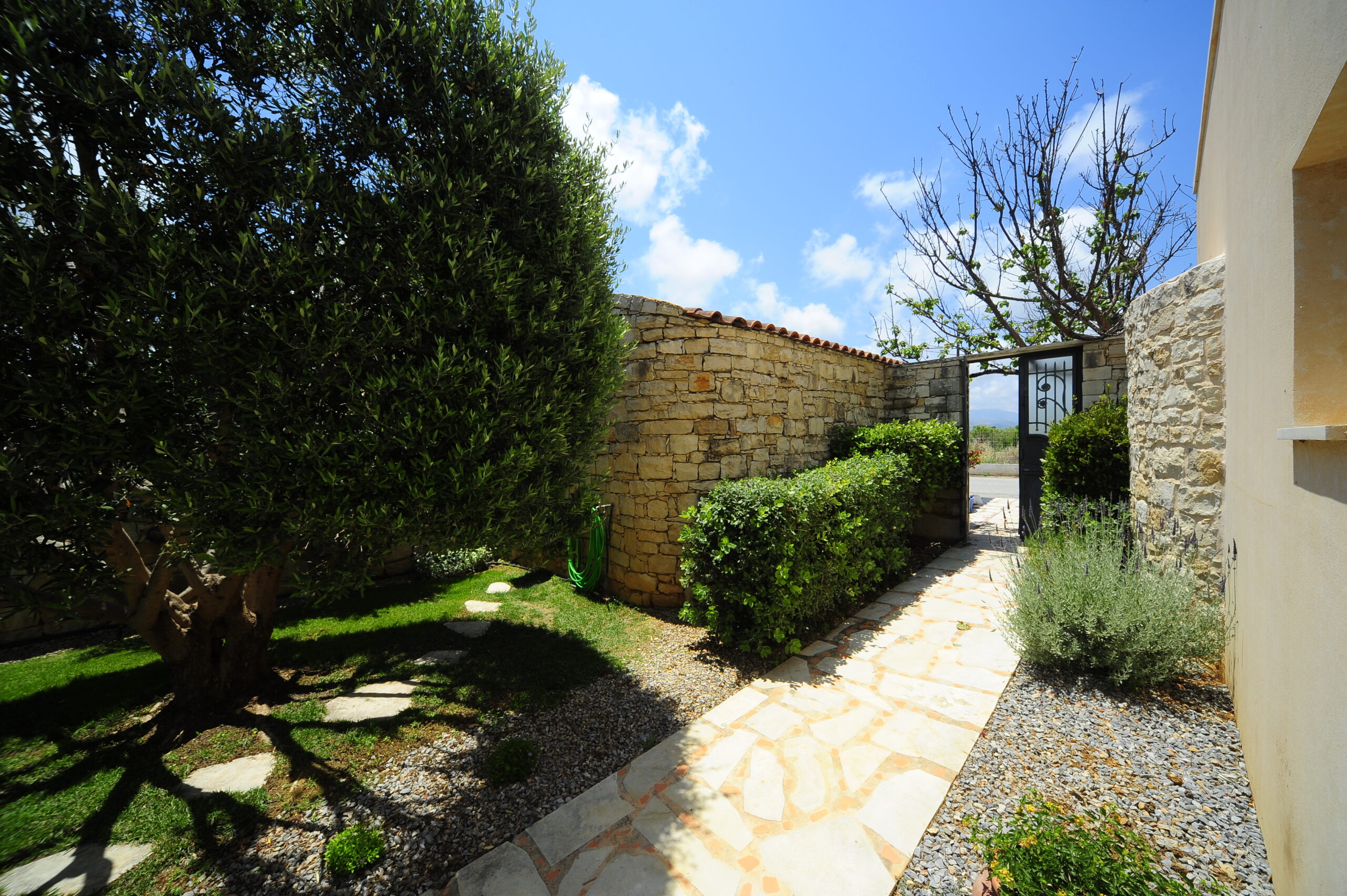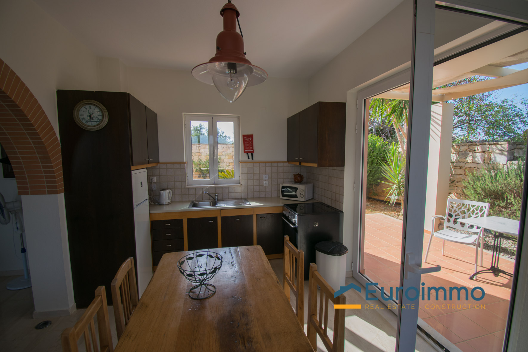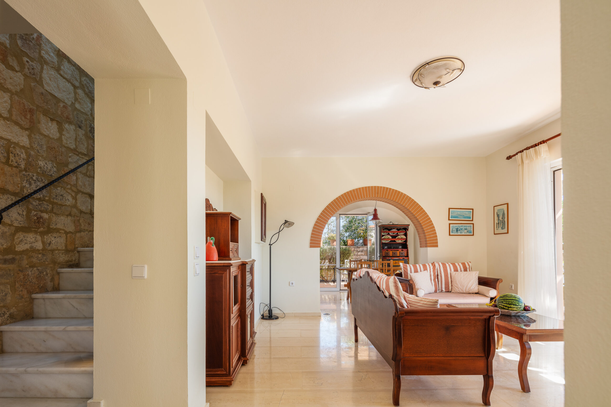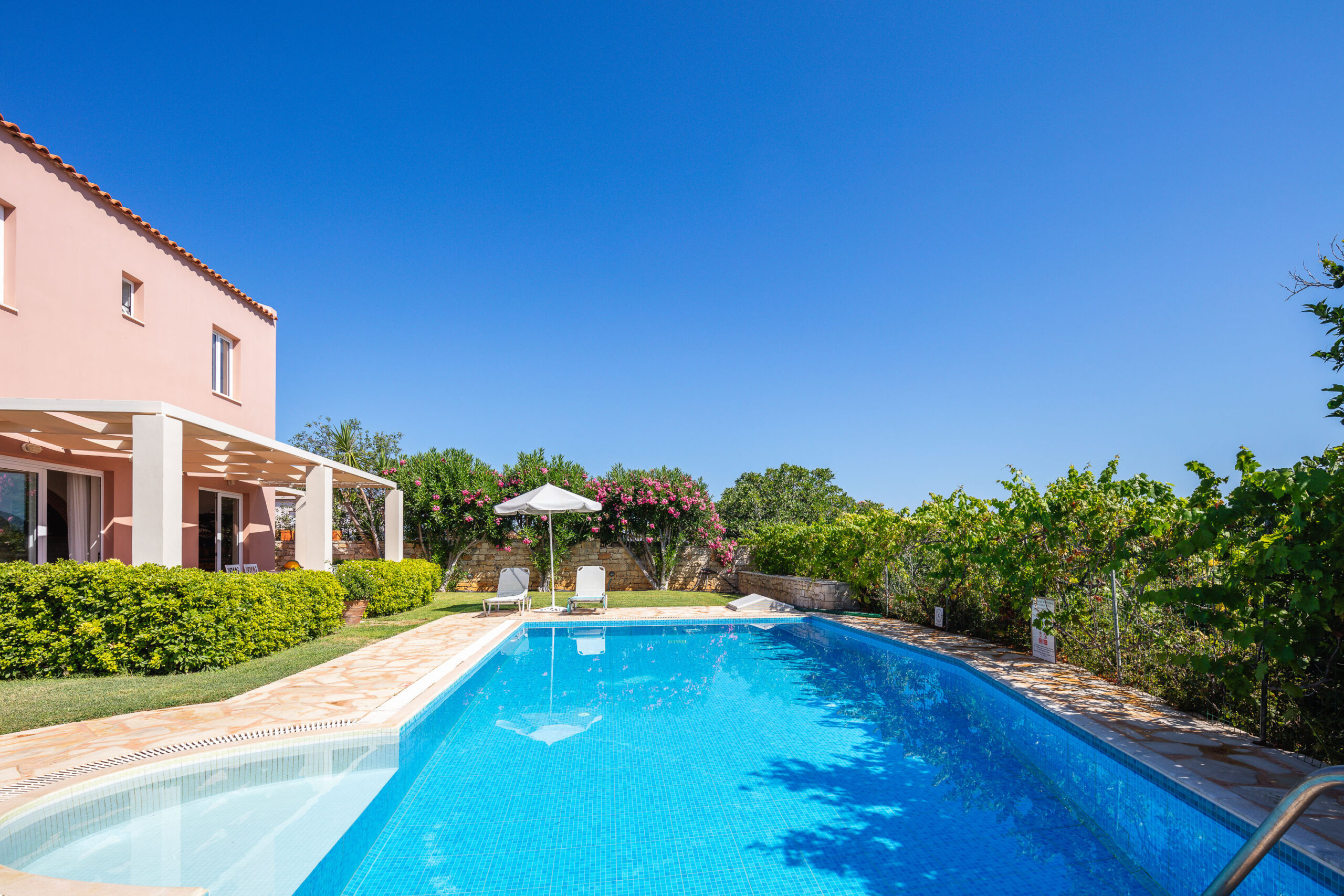 The villa for sale with pool is located on enclosed and well-maintained garden property in the beautiful and quiet atmosphere of a village. The free-standing, comfortable villa with pool is tastefully furnished and provides highest standards. Tradition and modernity in perfect balance are reflected in the interior of the villa. The well-maintained, green garden around the pool invites you to relax and simply enjoy your holiday. The beautiful wide view across the surrounding landscape is very relaxing and calming. On two floors the villa provides ample space and privacy to their guests. The living room on the ground floor is joined to an open kitchen with an arcade arch. A large sliding door opens the complete front of the house towards the terrace and the pool and extends the living room to the outside. From the kitchen you have direct access to a side terrace. The roofed terraces of the villa are ideal locations to relax in the sun or enjoy a meal in the open in a shady spot. 1 bedroom with exit to the side terrace and a bathroom are on the ground level. 2 bedrooms with a shared bathroom are on the first floor. One of the bedrooms has direct access to a private balcony that is the ideal place to read in quiet or relax and it has a magnificent view across the beautiful landscape. The 43sqm pool (4,5 x 9,5m, 1,30 to 1,60m deep, not heated) with surrounding lawn is perfect for a refreshing splash to escape the summer heat.