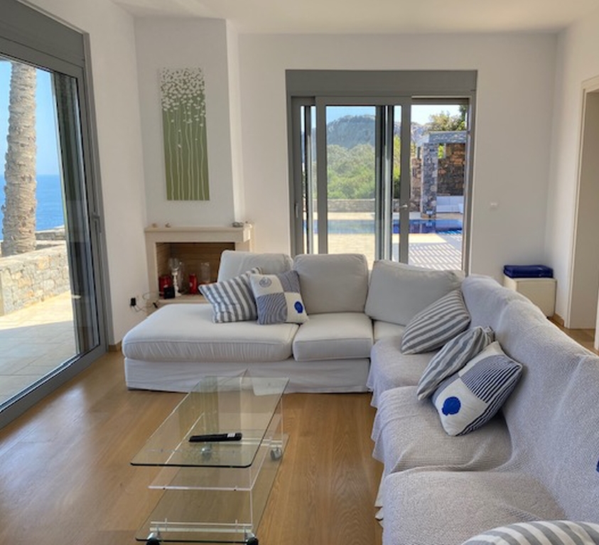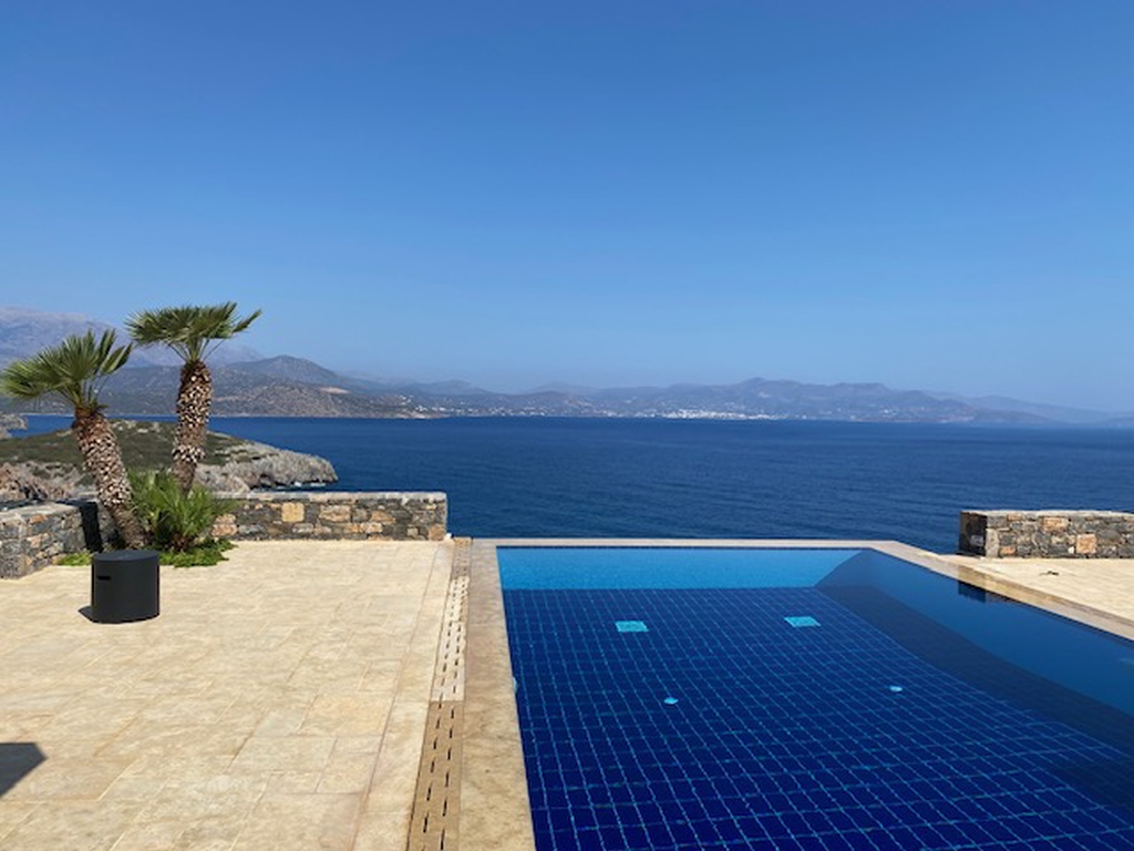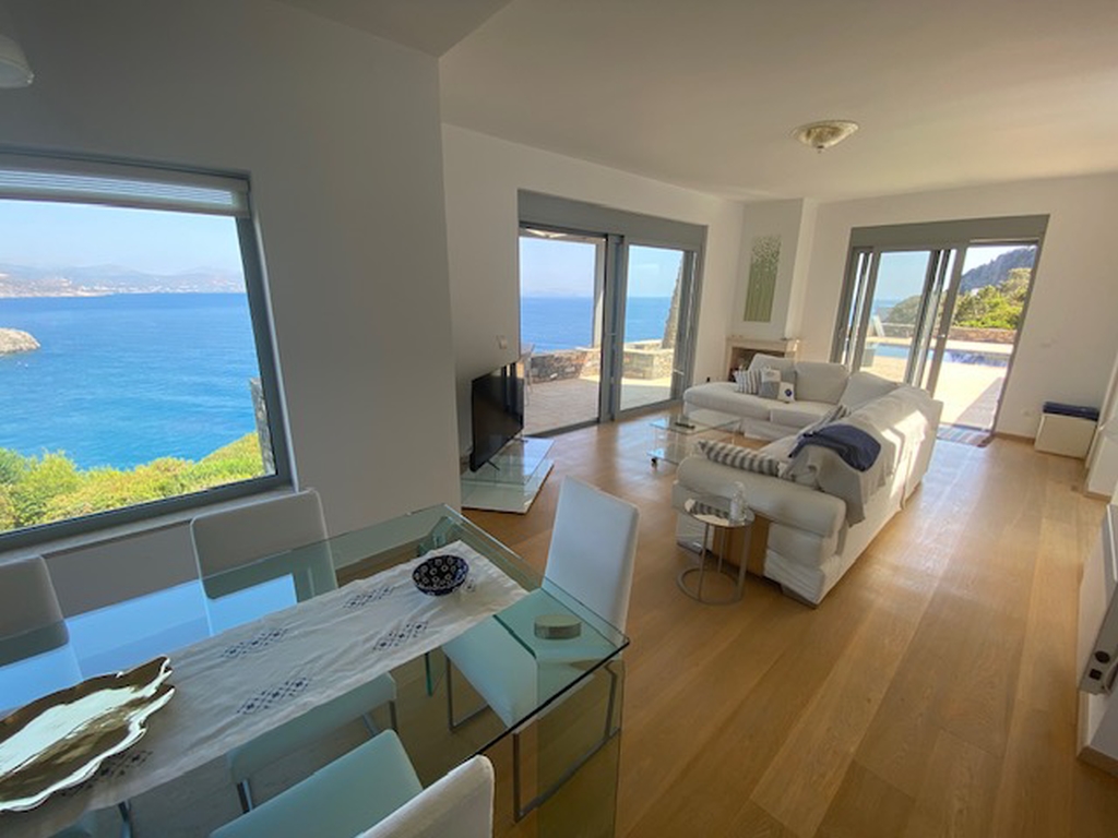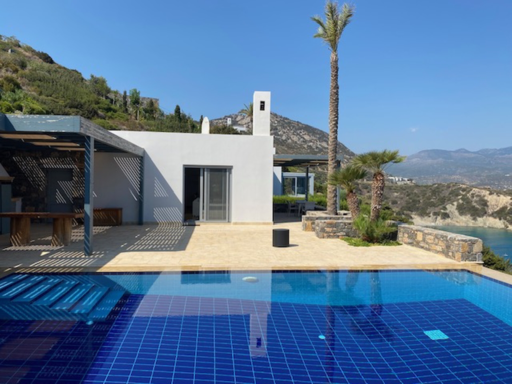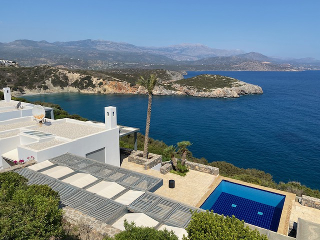 Three bedroom furnished seafront villa with pool located in a guarded luxury complex, on a private peninsula in the Eastern part of the island of Crete. The luxury villa is 180m2 on a plot of 2.100m2 with 50 meters of coastline. It is 12 km from the amenities of the picturesque Agios Nikolaos and only 72 km from the international airport of Heraklion. The first floor has an open living and dining area, a fully equipped modern kitchen and a WC. The ground floor includes three bedrooms and two bathrooms. The main rooms have French-style doors that open onto the Cretan paver, with covered verandas leading to the private infinity pool and the outdoor seating area. The view of Mirabello Bay is indescribable. In addition, there is a parking area and wonderful landscaped gardens where stone steps lead to the sea. The very high quality of the materials both for the construction and the furnishing in combination with the natural beauty of the location and the surrounding area, make it an ideal residence to live the life you dream.