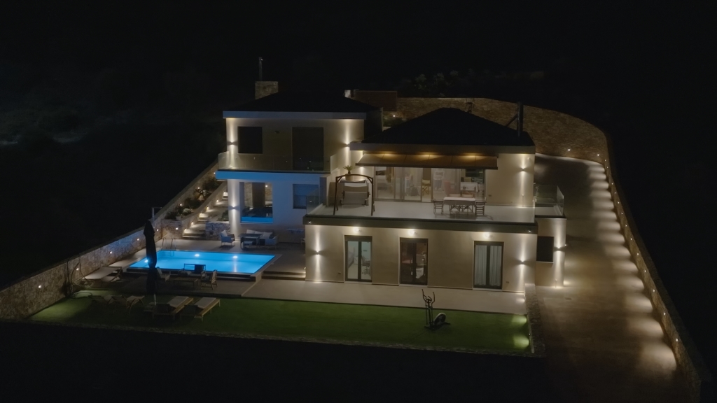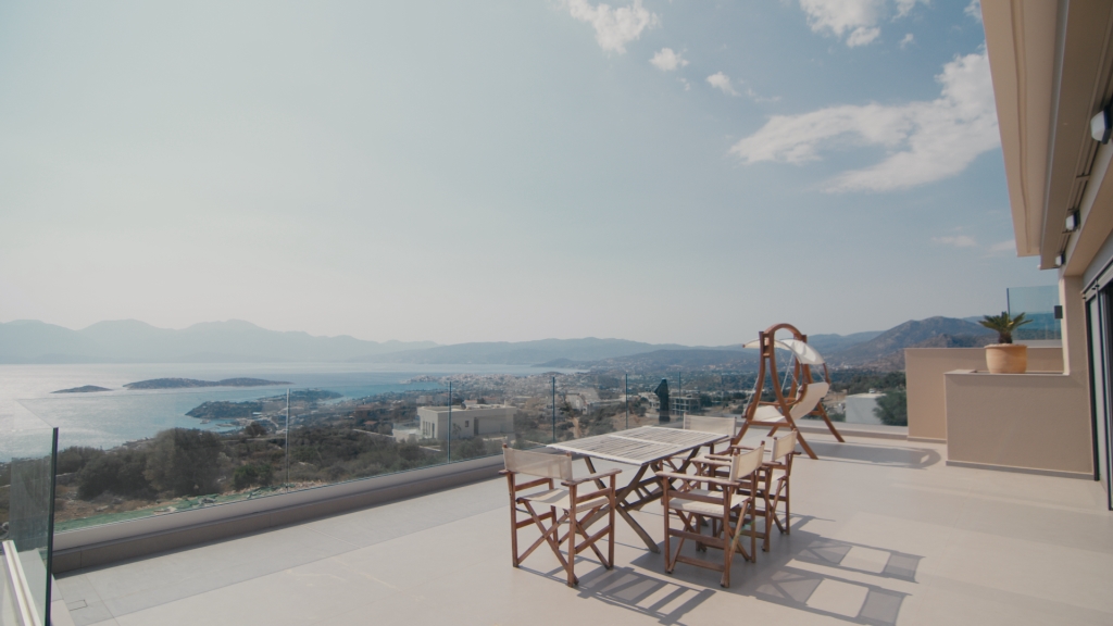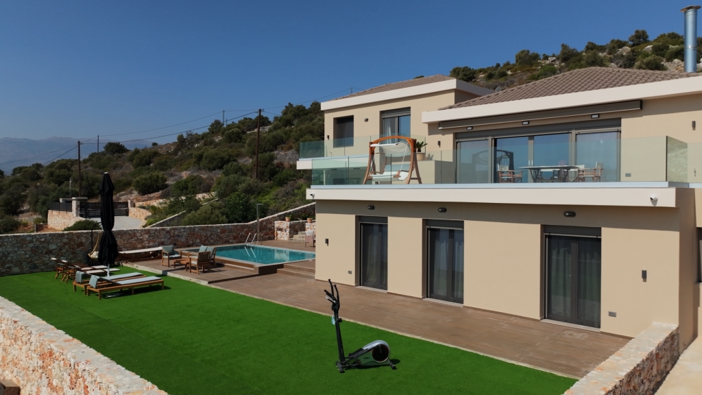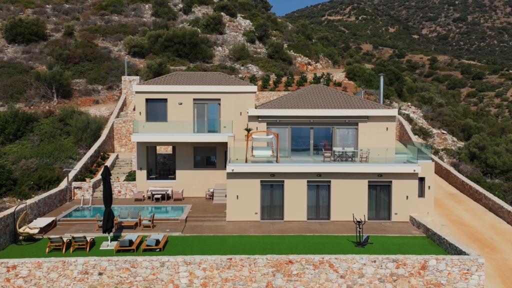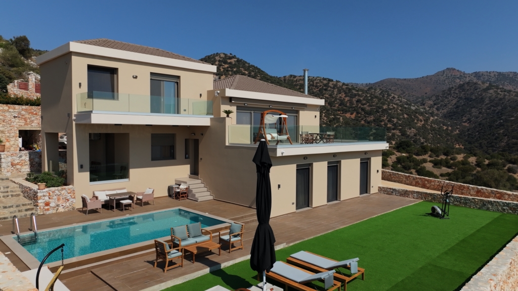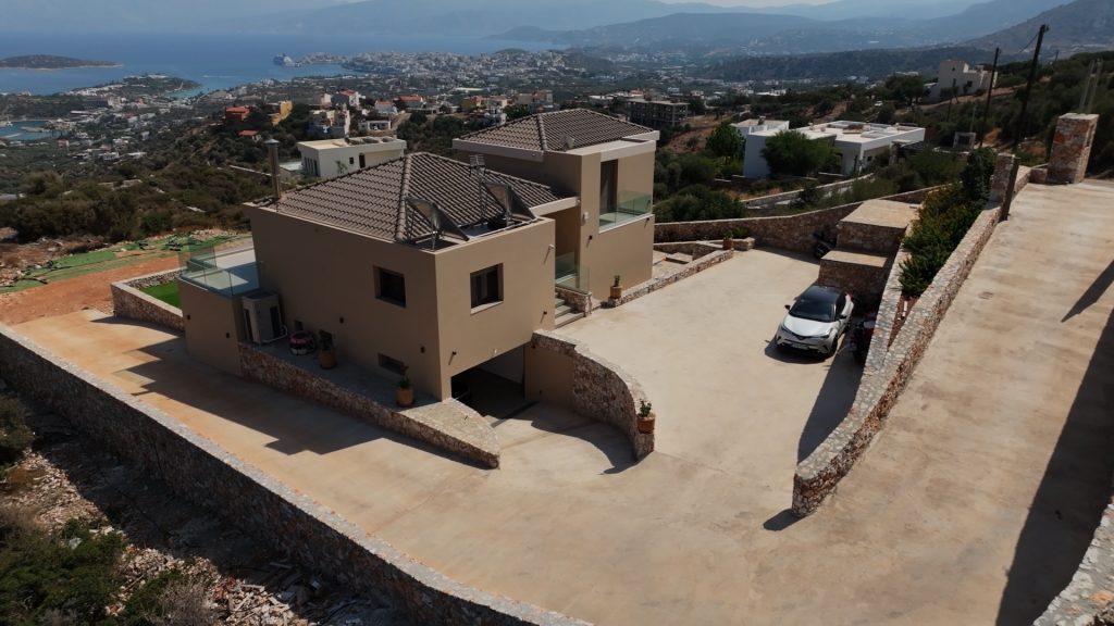 Luxury villa of 270m2 is available for sale in a unique location 3km from the sea and 4km from the center of the town Agios Nikolaos. The villa is built on a hill offering a magnificent panoramic view of Mirabello Bay and is developed on two levels. On the upper level there are a large open area space of the living room-dining room with a fireplace, a WC and a modern fully equipped kitchen that open onto a rather large terrace. Also on the same level is the master bedroom with en-suite bathroom and a walk-in wardrobe that opens onto its own balcony. On the lower level there are three comfortable bedrooms and two bathrooms. On this level there is also a guesthouse - studio with its own kitchen. All areas of the villa are elegantly decorated and have air conditioning. In addition, it has solar, central heating and is characterized by tiled roofs. In the outdoor area of 2.600 m2 there is an infinity pool, a garden with lawn, an outdoor parking space and in addition it has an indoor garage. Uniquely built villa in an ideal location for moments of relaxation offering comfort and luxury.
