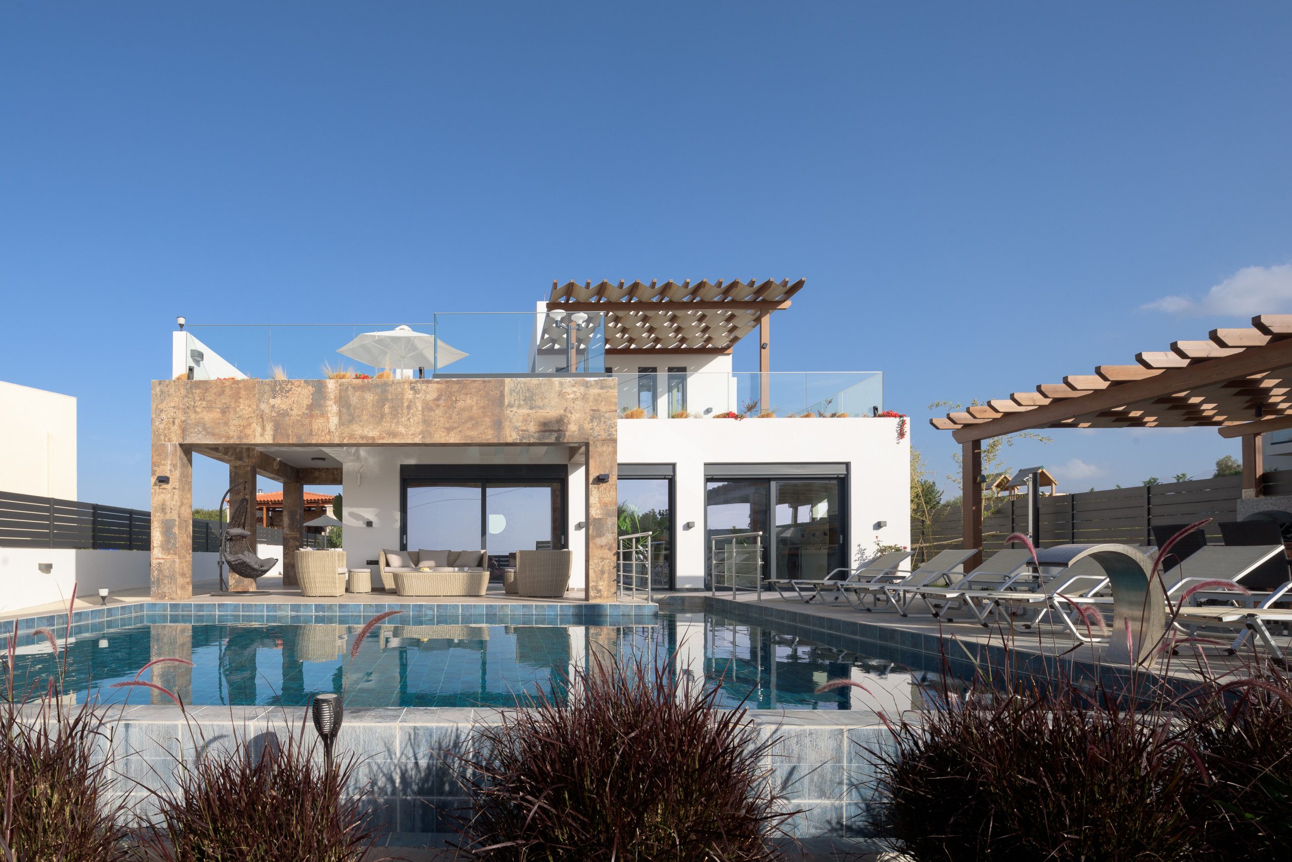 Set in 807 m2 of beautiful settings, the villa is just ten minutes driving distance to the lively city of Rethymno, and within a few minutes walking distance you can enjoy Skaleta Beach. The home features a 50m2 private swimming pool and ample outdoor design-led settings. The sublime home also features and outdoor shower and an iconic balcony at the first floor featuring wonderful sea views and perfect for sunset views.