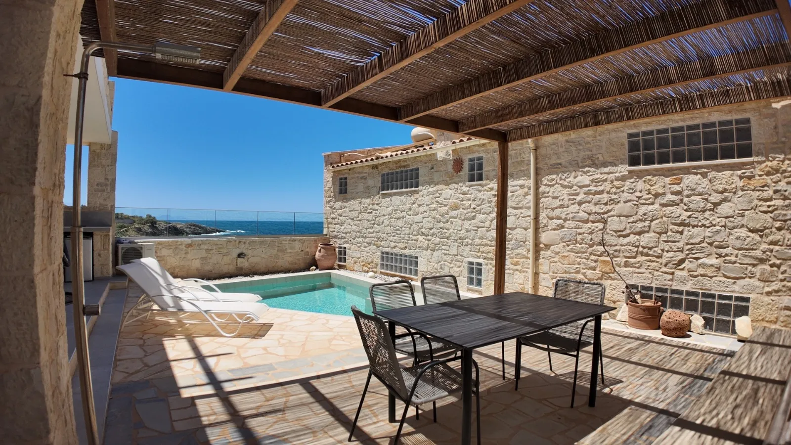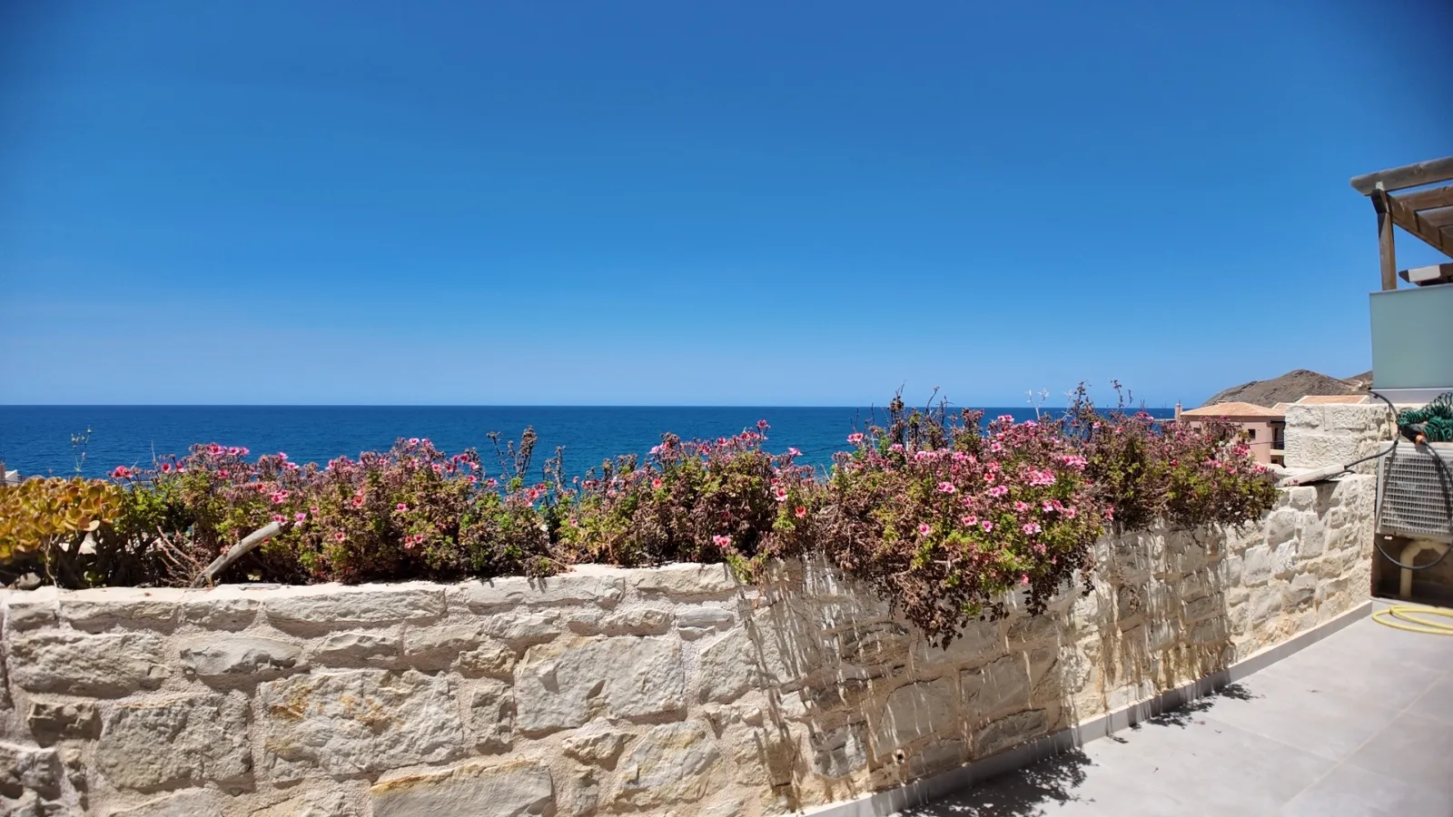 À l'extérieur, profitez d'une terrasse couverte par une pergola, d'une piscine privée et d'un petit jardin. Entièrement meublée et proche des commerces, des cafés et des plages, cette propriété est une excellente opportunité dans l'un des villages balnéaires les plus pittoresques de Crète.