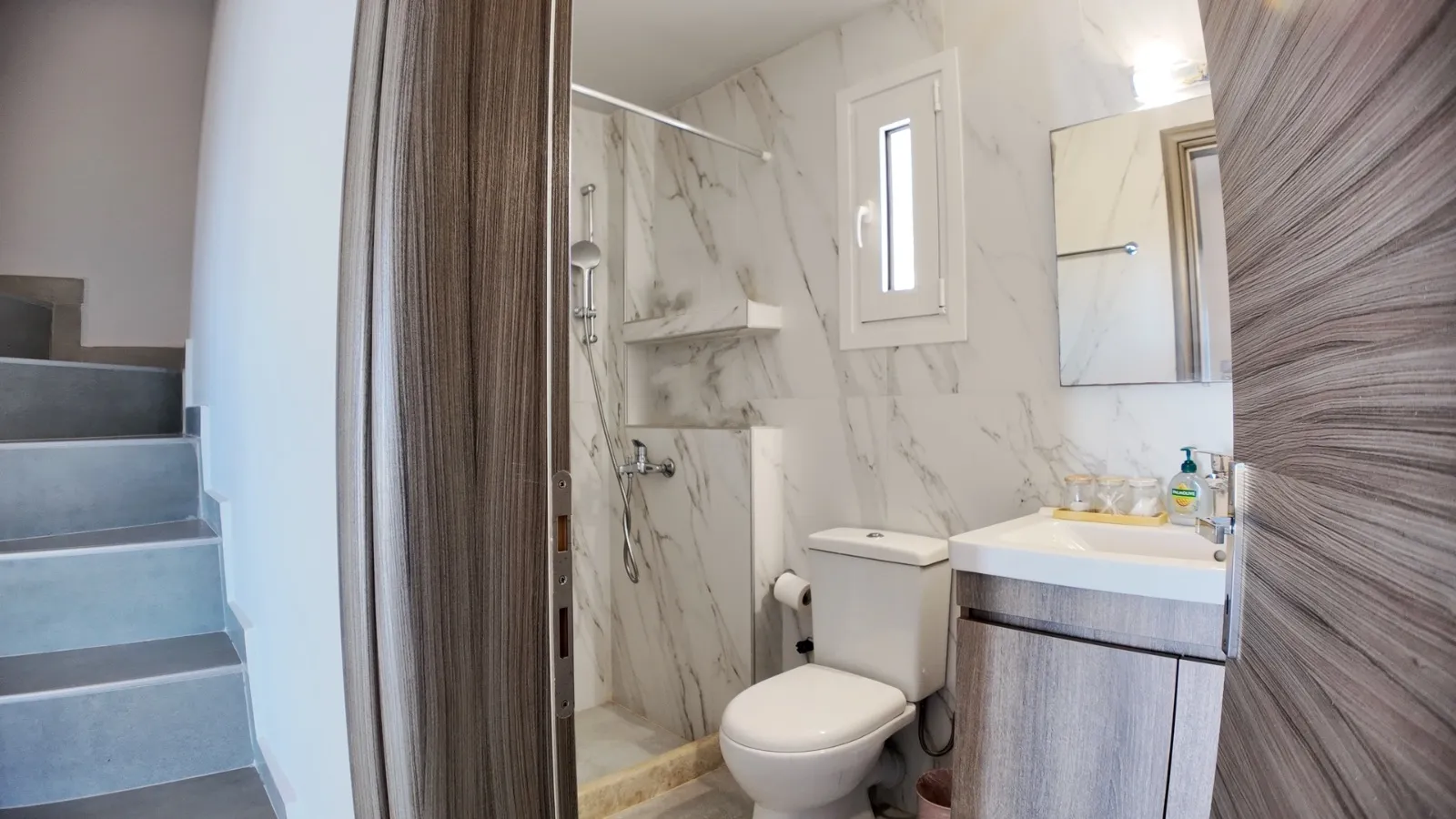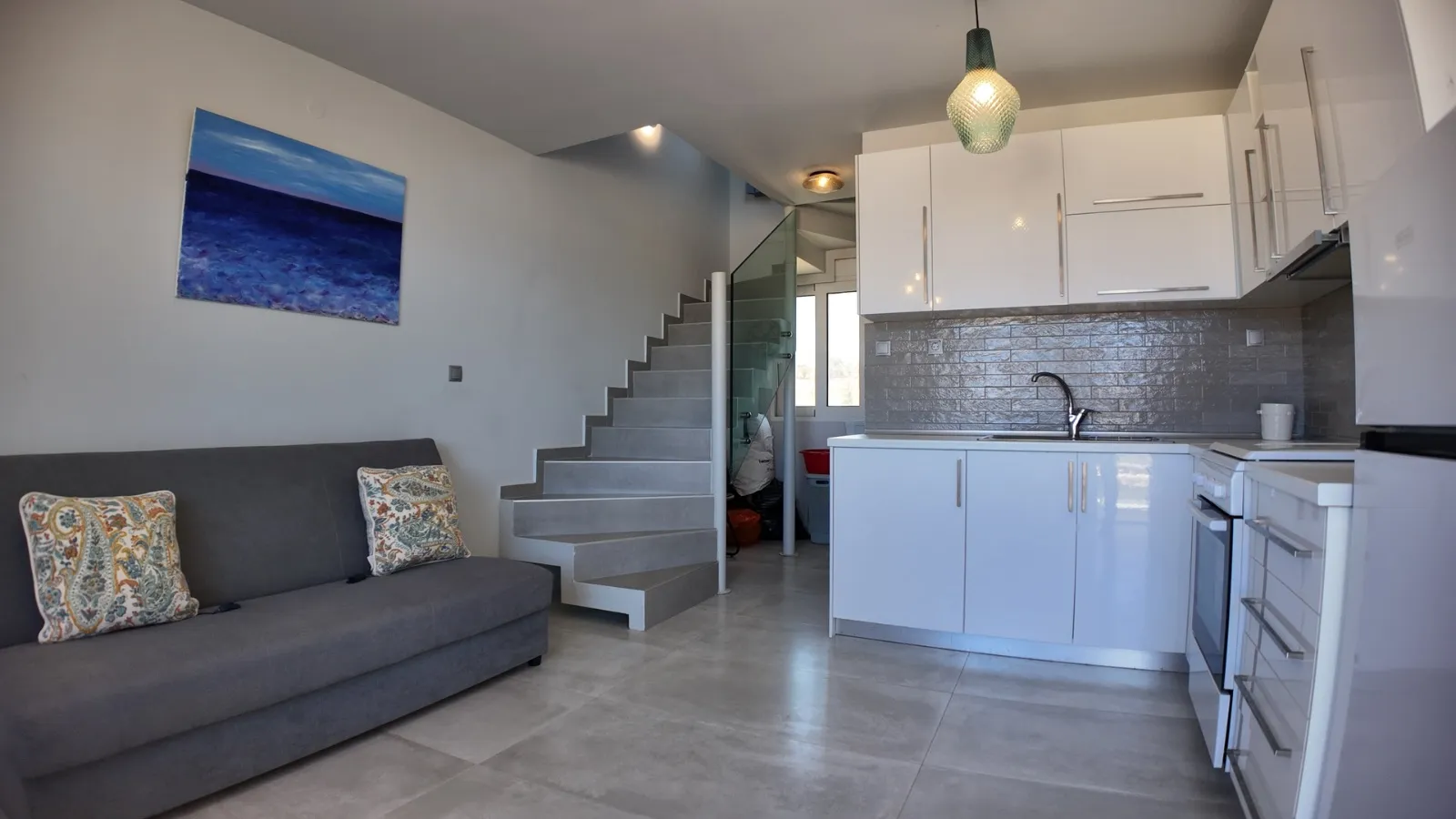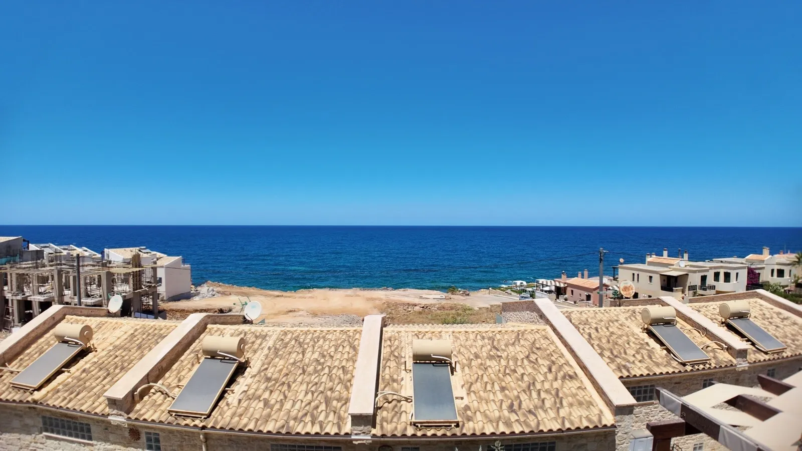 La maison principale comprend un spacieux séjour, une cuisine et une salle de bain au rez-de-chaussée, deux chambres et une salle de bain au premier étage, et une troisième chambre avec WC au dernier étage. Aux étages supérieurs, les terrasses avec vue sur la mer offrent d'agréables moments de détente.